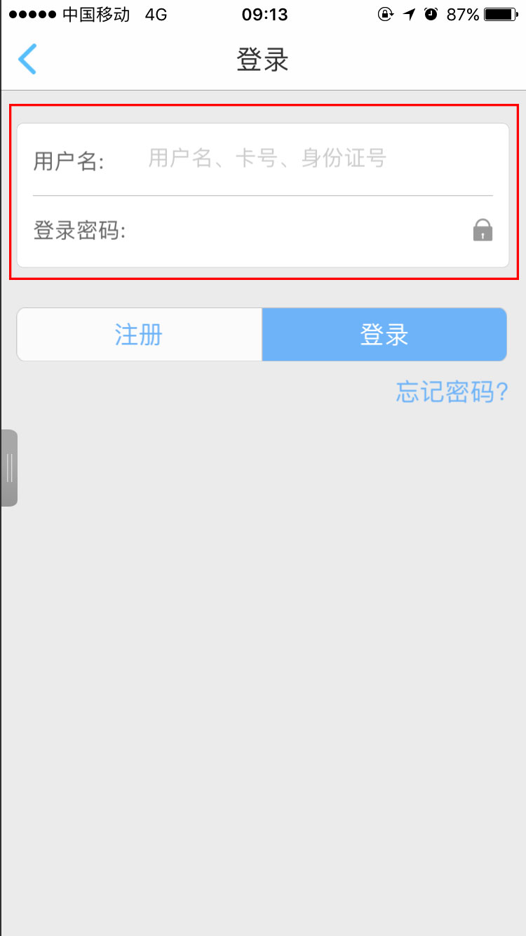 4、登陸您的用戶名(用戶名、卡號、身份證)以及密碼登陸,若密碼錯(cuò)誤請點(diǎn)擊忘記密碼進(jìn)行重置。