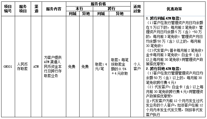 因業(yè)務(wù)發(fā)展需要,我行自2018年4月1日起調(diào)整人民幣存取款服務(wù)收費(fèi)項(xiàng)目,根據(jù)《商業(yè)銀行服務(wù)價(jià)格管理辦法》(中國銀監(jiān)會(huì) 國家發(fā)展改革委令2014年第1號(hào))規(guī)定,現(xiàn)將調(diào)整后的服務(wù)項(xiàng)目及價(jià)格予以公示: