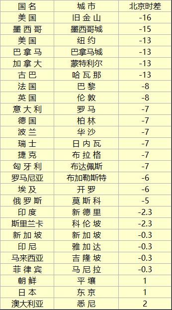 國(guó)際各大城市與北京的時(shí)差,僅供參考: