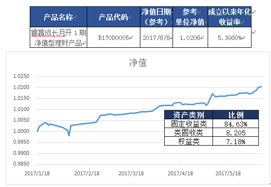 本產(chǎn)品將于2017年6月12日再次開放申購贖回,自2017年1月18日成立以來,截至2017年6月8日,本產(chǎn)品本次開放周期累計凈值1.0206,成立以來年化收益率5.3060%。