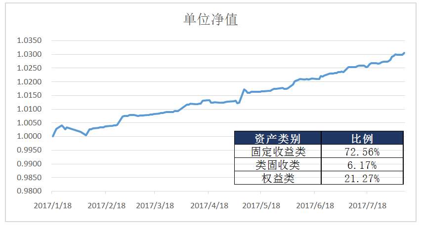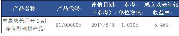 本產(chǎn)品將于2017年8月10日再次開放申購贖回,自2017年1月18日成立以來,截至2017年8月8日,本產(chǎn)品本次開放周期累計(jì)凈值1.0305,成立以來年化收益率5.46%。