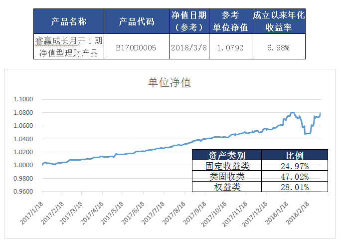 本產(chǎn)品將于2018年3月12日再次開(kāi)放申購(gòu)贖回,自2017年1月18日成立以來(lái),截至2018年3月8日,本產(chǎn)品本次開(kāi)放周期累計(jì)凈值1.0792,成立以來(lái)年化收益率6.98%。