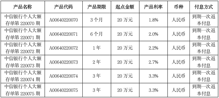 中信銀行個人大額存單第220070-220075期發(fā)行公告