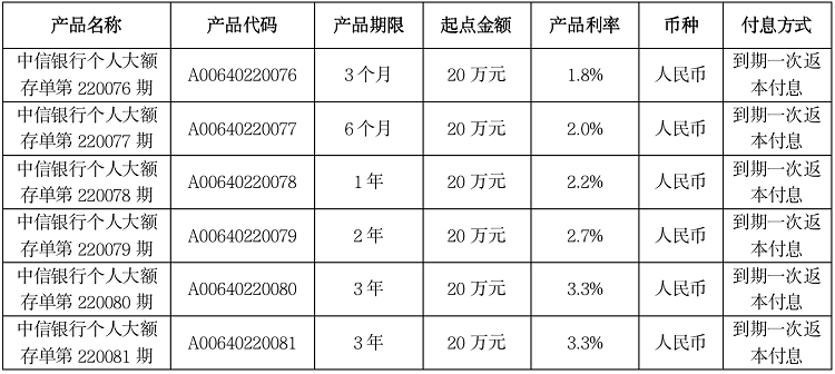 中信銀行個(gè)人大額存單第220076-220081期發(fā)行公告