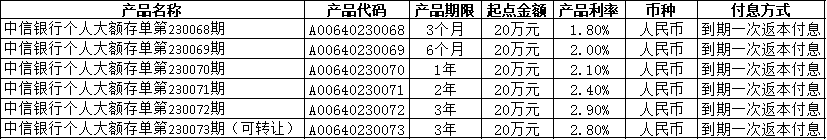 中信銀行個(gè)人大額存單第230068-230073期發(fā)行公告