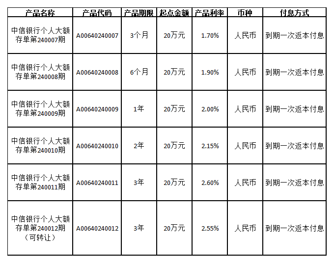 中信銀行個人大額存單第240007-240012期發(fā)行公告