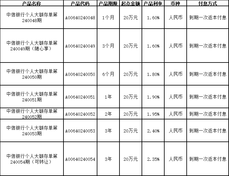 中信銀行個(gè)人大額存單第240048-240054期發(fā)行公告