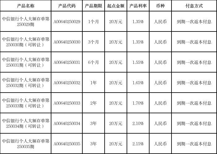 中信銀行個(gè)人大額存單第250029-250035期發(fā)行公告