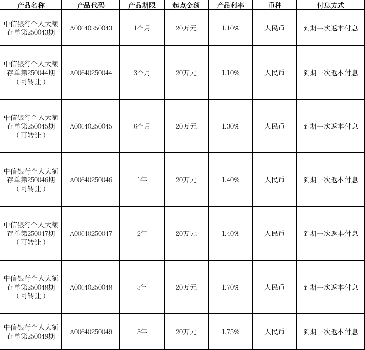 中信銀行個人大額存單第250043-250049期發(fā)行公告