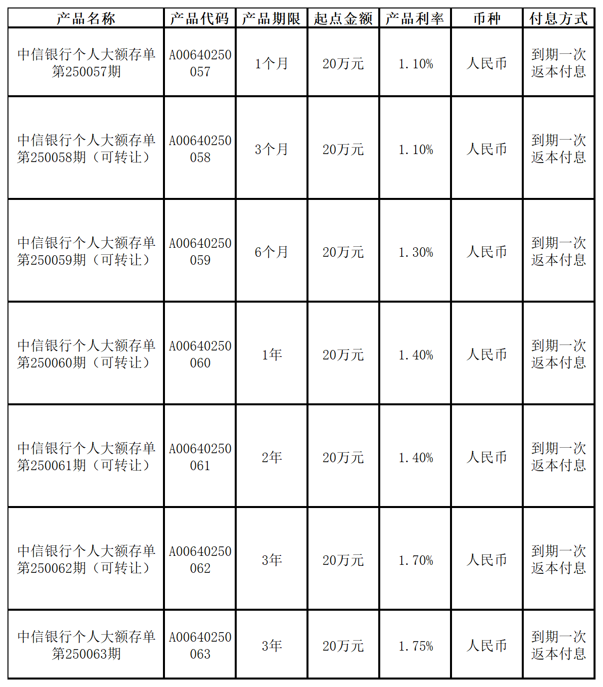 中信銀行個人大額存單第250057-250063期發(fā)行公告